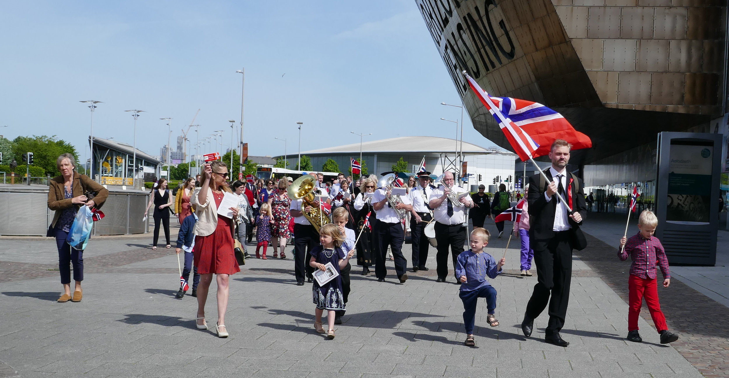 Last Thursday, May 17th, Cardiff Bay came alive with brass band music and happy children waving flags, as the Norwegian contingent in South Wales took to the streets to celebrate their national day. It was a gloriously sunny day, and the Norwegians wearing traditional costumes and their very finest clothes, paraded in traditional fashion from the Millennium Centre to the Norwegian Church Arts Centre, where they celebrated their country’s independence.