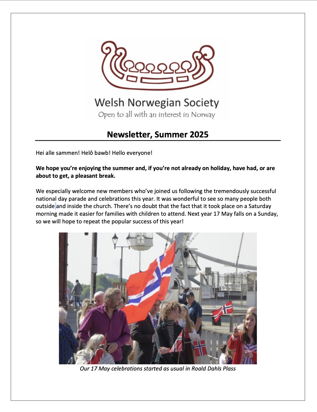 We apologise for the lack of communication and absence of events so far in 2025. Thank you for your patience. We just haven’t yet been able to build a calendar of events this year. Like all voluntary societies these days, we are short of volunteers to take on the duties (and rewards!) of organising and communicating activities. The big calendar events of the year – Norwegian national day, the midsummer party and the Festival of Light and Friendship at Christmas – absorb a lot of our capacity. We would welcome help with those, and/or the much less taxing monthly get-togethers. We have use of the Norwegian Church in Cardiff Bay; we can also travel and meet up elsewhere, as we did in Abergavenny last year. But it is always helpful to have a focal point – a speaker, a topic, an activity (such as cooking, crafting or learning the language) to bring people in. We know there is interest but cannot meet the demand with the existing resources. If you’d be willing and able to take on some of the load – however little – we’d love to hear from you. This is the 30th anniversary year of the WNS and we’d very much like to keep going!
