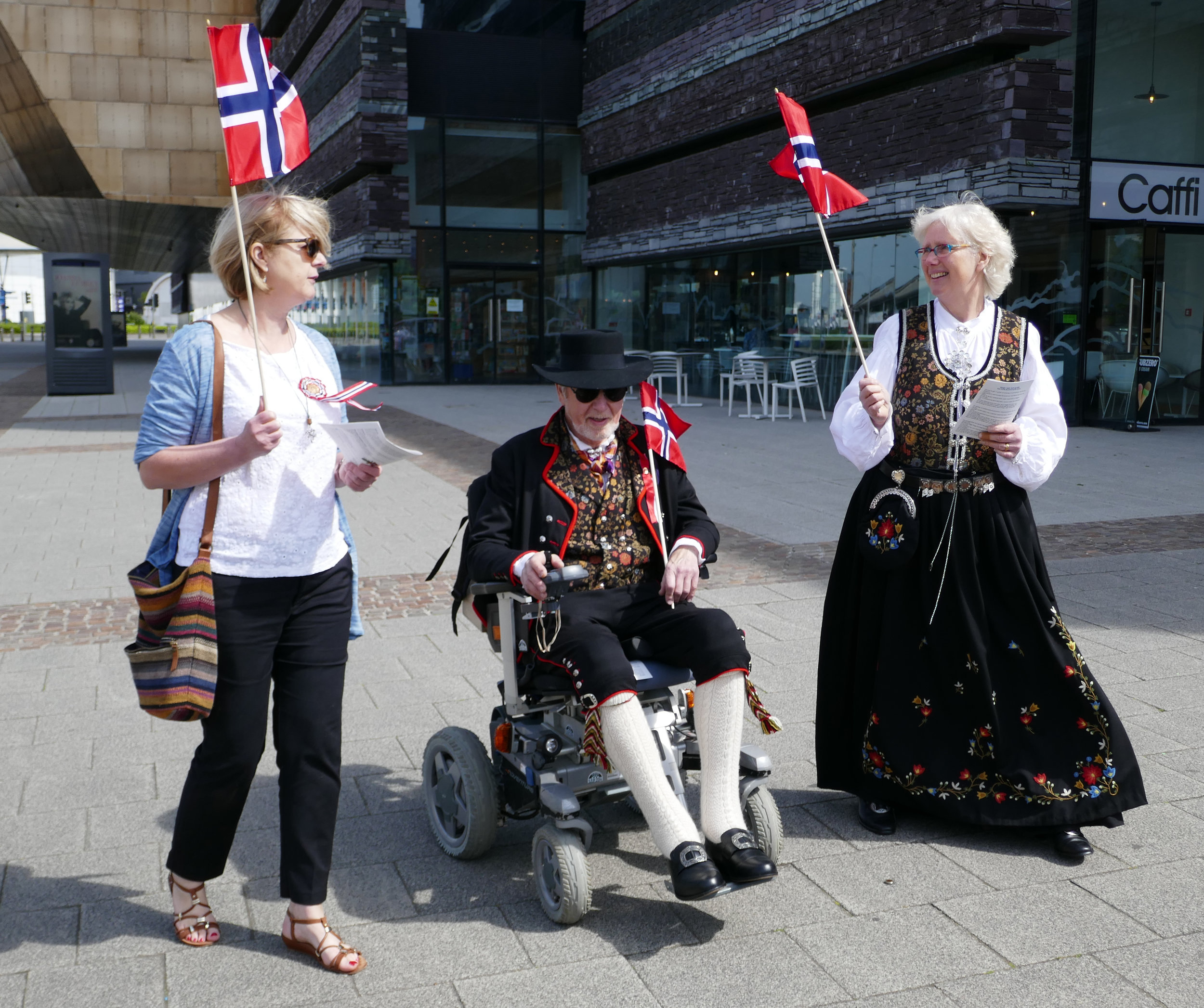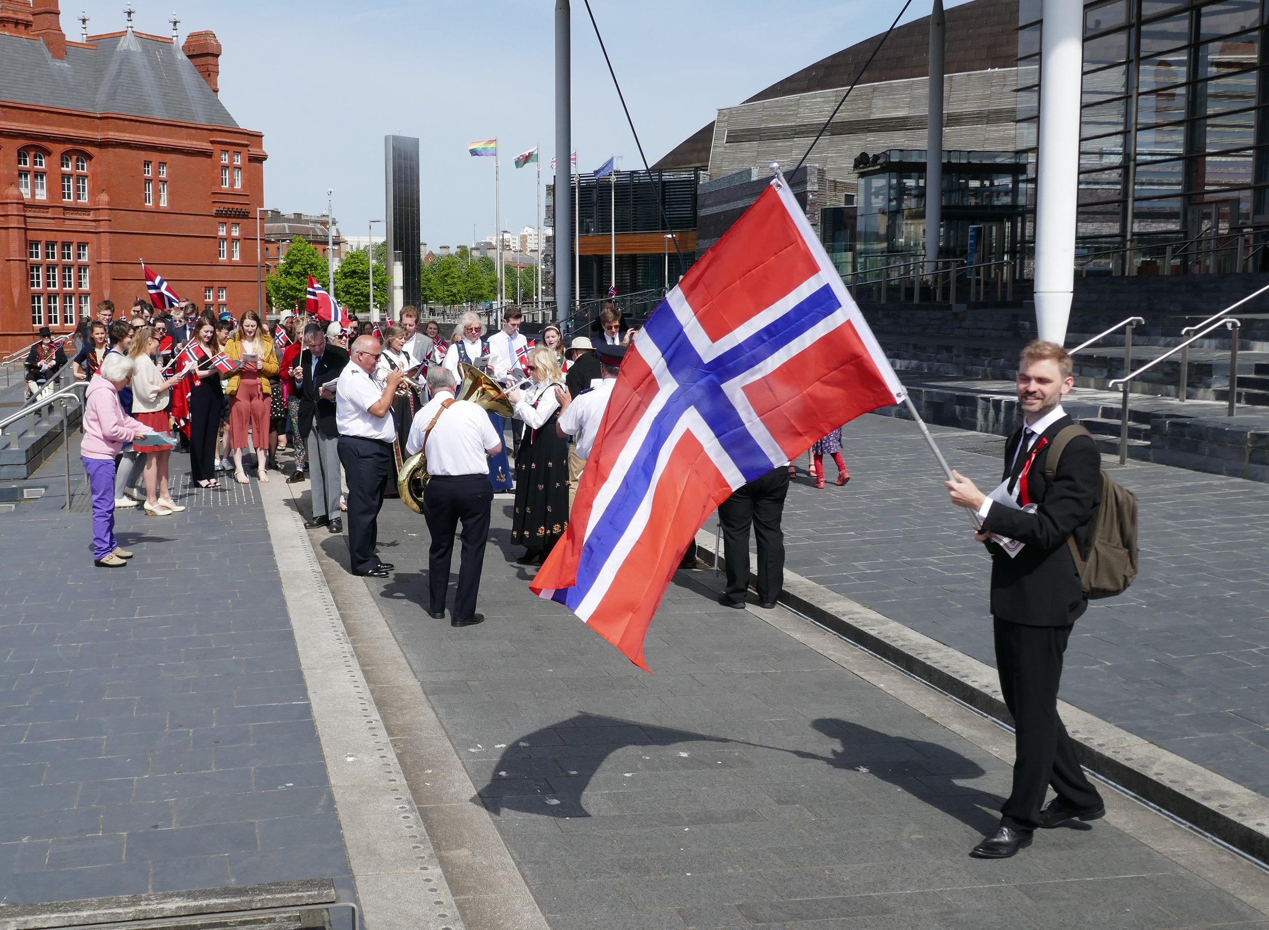 Norwegians in national dress will lead a procession from the Wales Millennium Centre to the Norwegian Church, accompanied by the band of the Salvation Army. At the church the instantly recognisable flag will be hoisted and the Norwegian anthem sung. The Norwegian community and its friends in Wales will welcome dignitaries from both Wales and Norway.