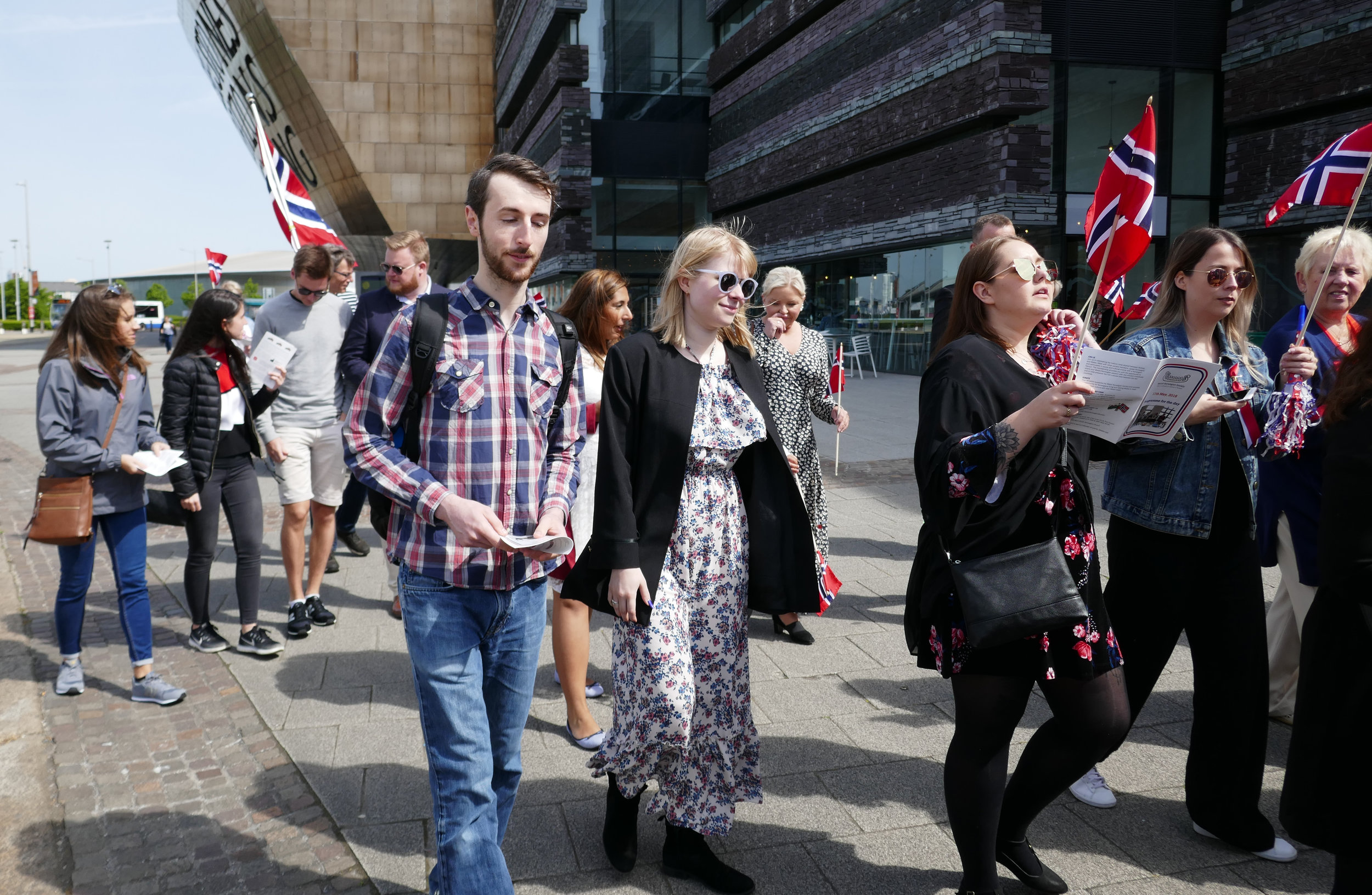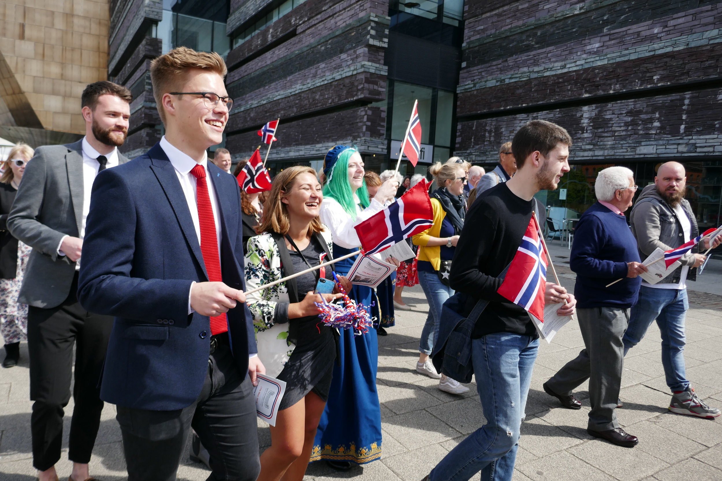 Norwegian Constitutional Day celebrations were held in Cardiff Bay on the 17th May. Over one hundred Norwegians and other nationalities with an interest in Norway came together to parade from the Wales Millennium Centre to the Norwegian Church Arts Centre.
