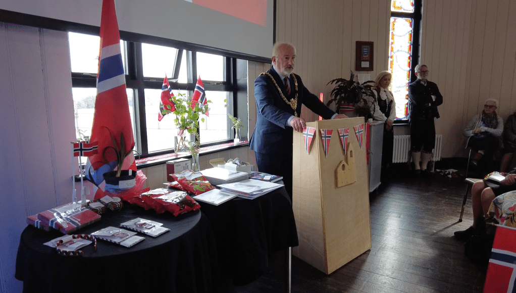 Tony Olavesen, one of the Welsh Norwegian Society’s new honorary members, recalled the wartime collaboration between the UK and Norway. He laid a wreath to recall those who lost their lives fighting to preserve freedom.